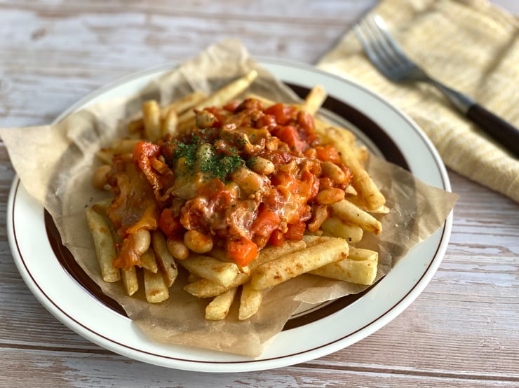4.フライドポテトをお皿に盛り、温めたポークビーンズをかけます。
