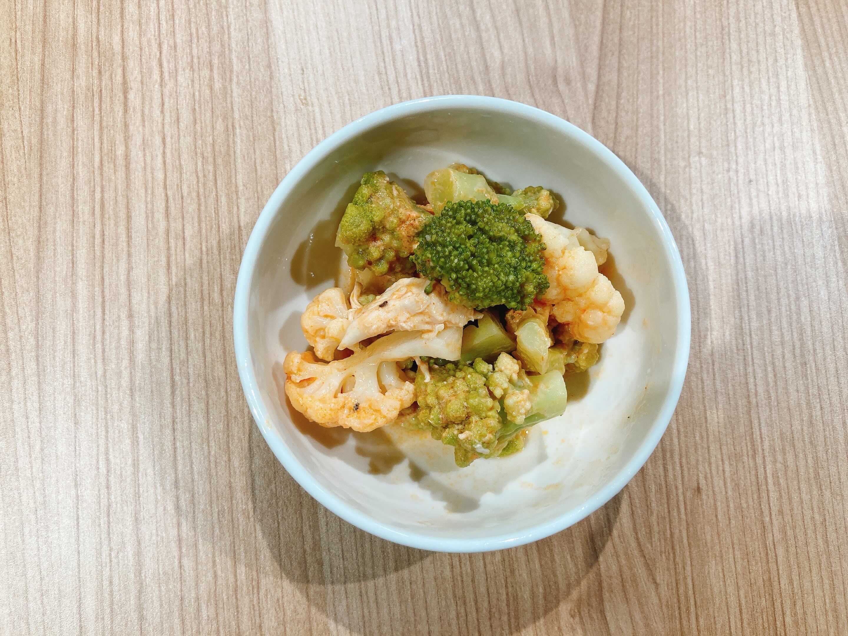蒸し鶏のほぐし身に、ロマネスコ・カリフラワー・ブロッコリーの花野菜を合わせてお届けしたこちらのメニュー。