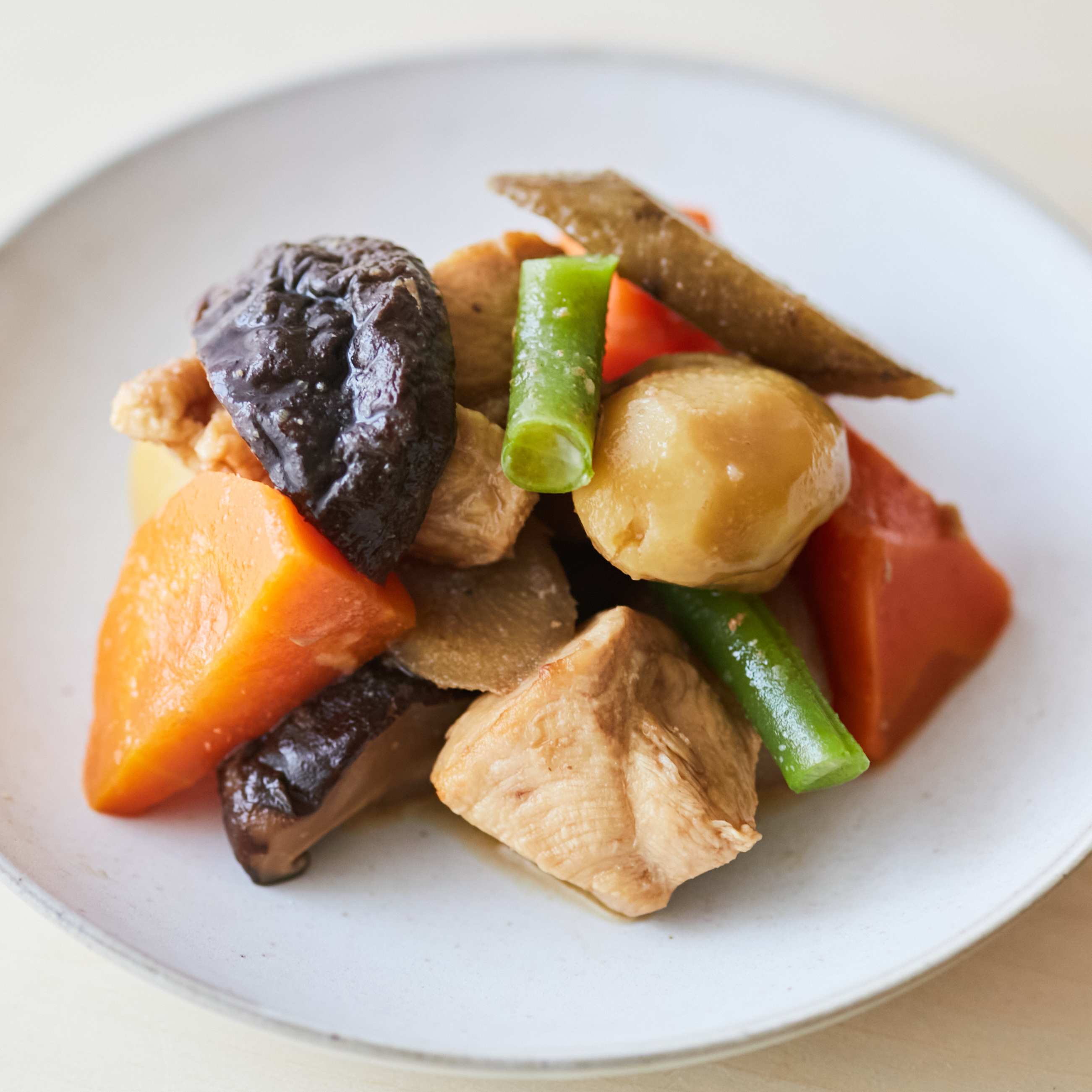 さっぱりした鶏むね肉を、お野菜と一緒に優しく煮込みました。季節を感じていただけるよう、具材には栗も入れて仕上げています。ほっとするお味をぜひお楽しみください!