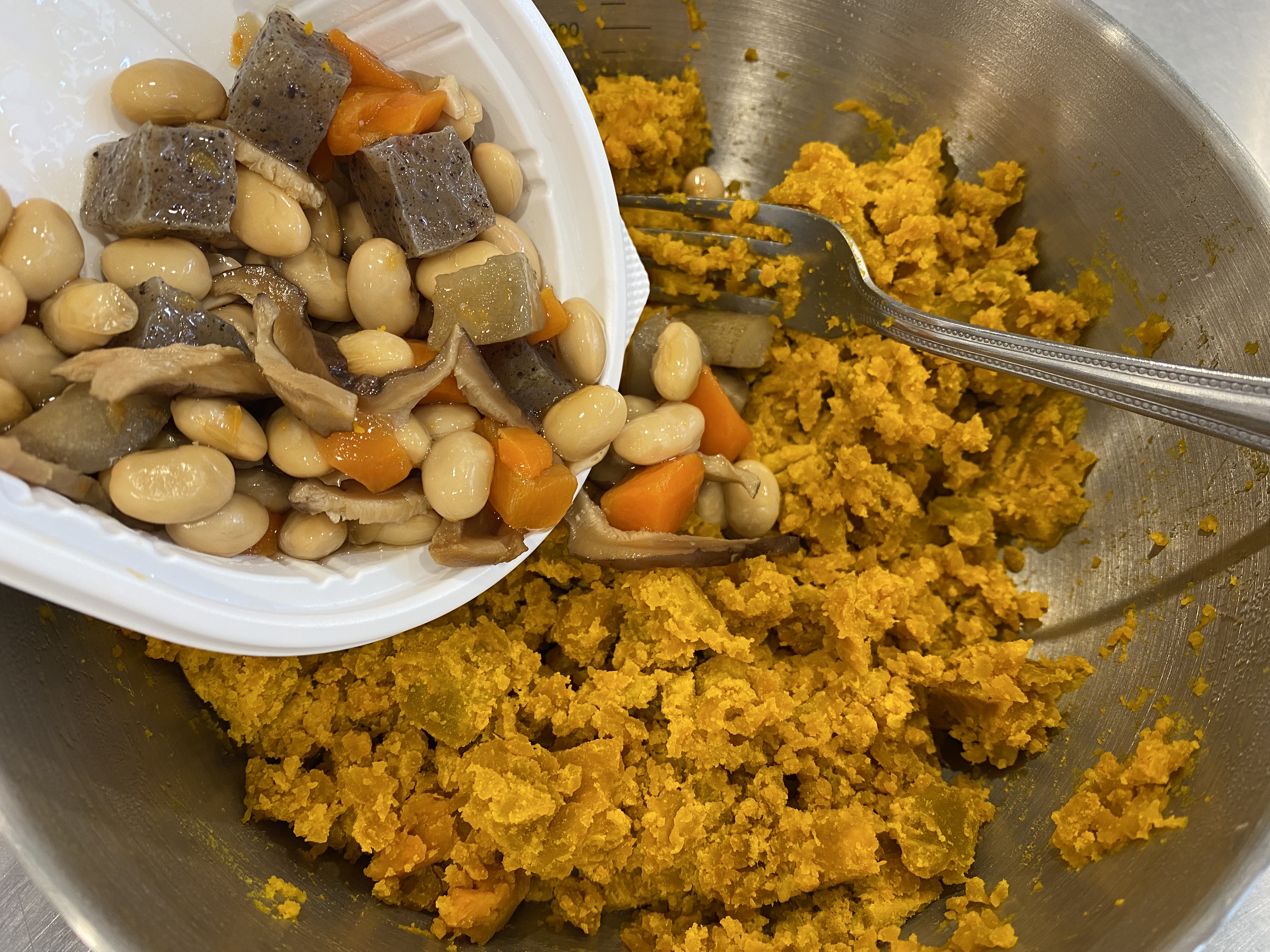 3.柔らかくなったかぼちゃをフォークでつぶし、五目豆と醤油を混ぜます。
