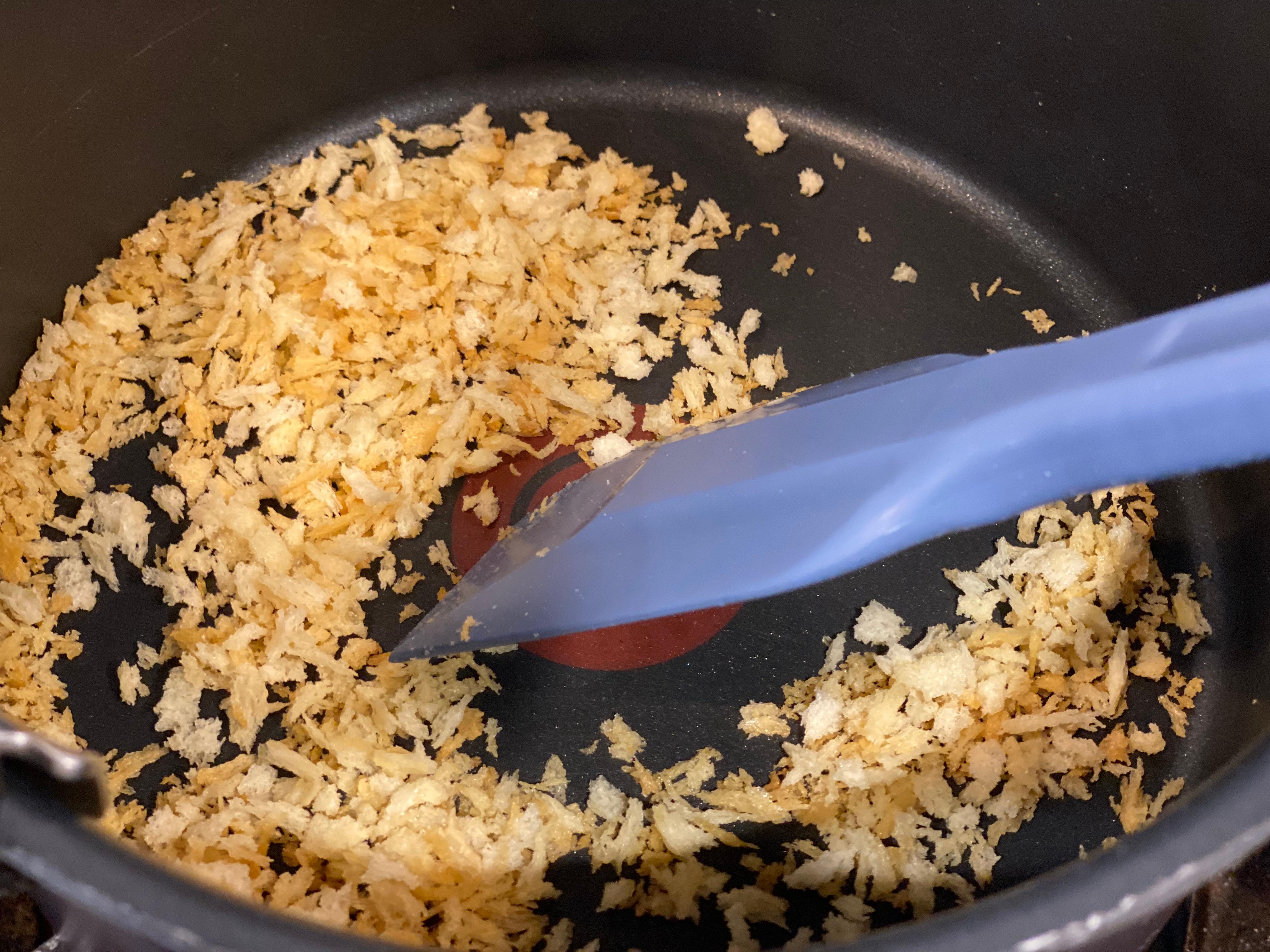 2.かぼちゃを加熱している間に、バターとパン粉をフライパンで炒ります。