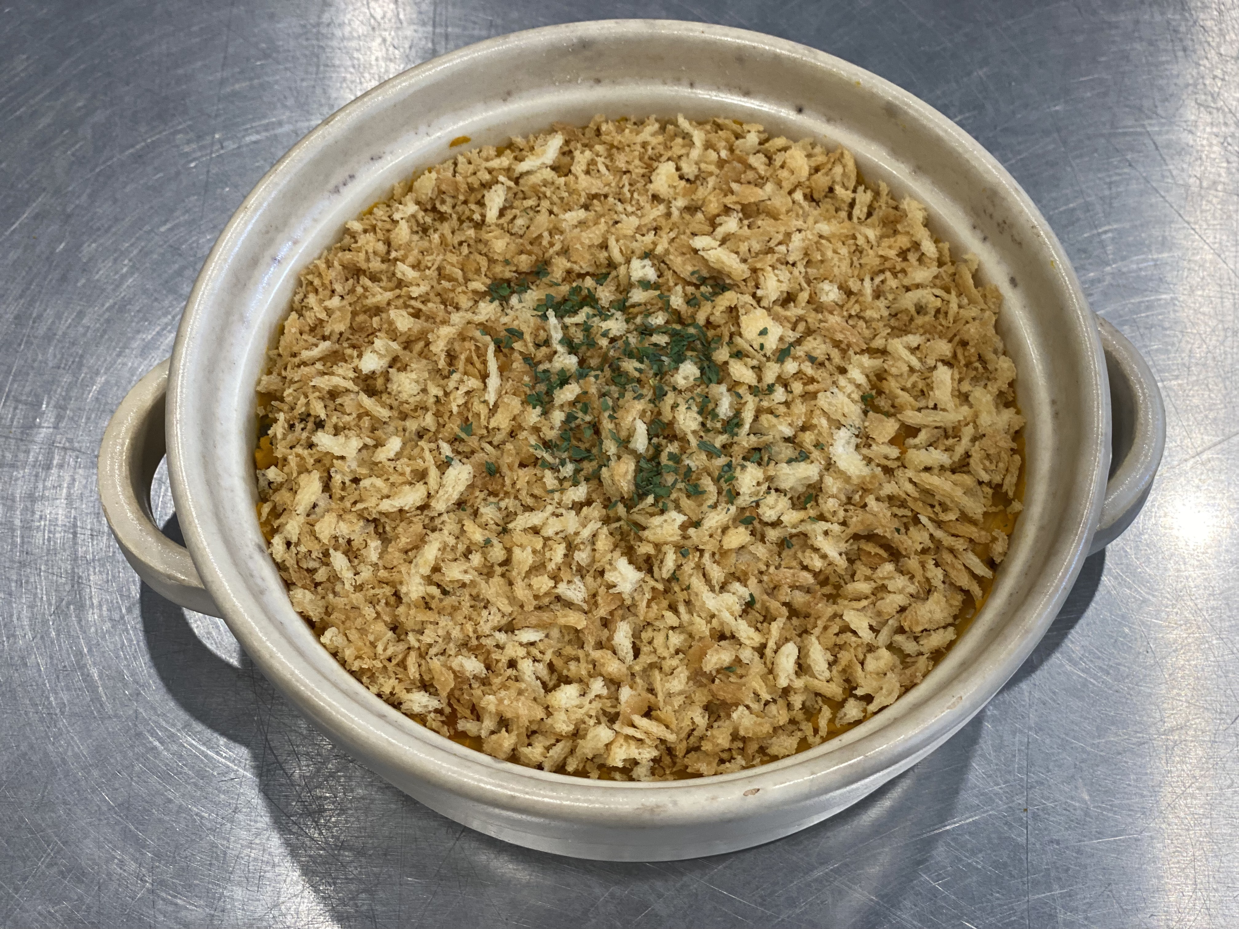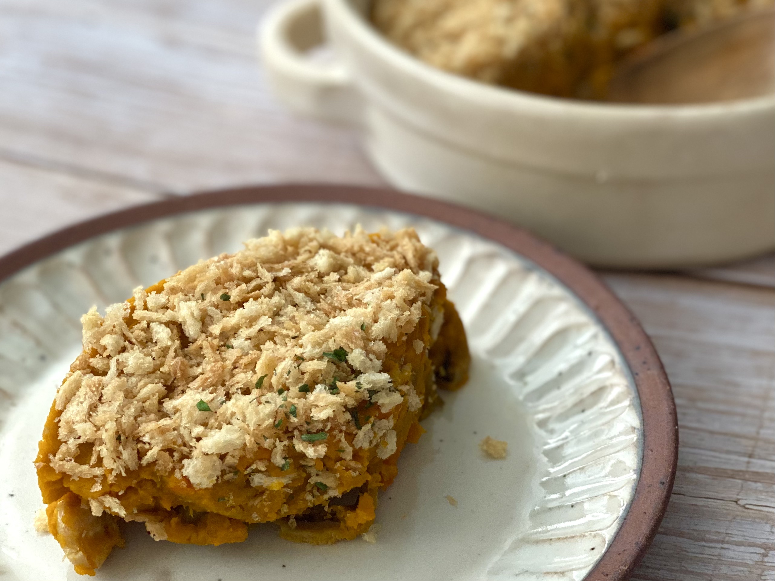 4.器にかぼちゃを入れて表面をならし、炒ったパン粉をのせます。