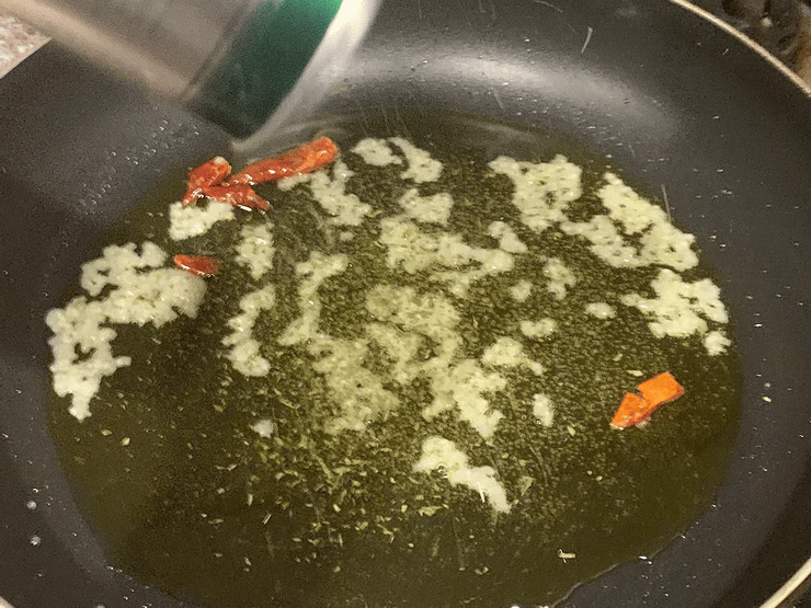 ごく弱火でニンニクの香りが出始めたら、種をぬいた鷹の爪をいれます