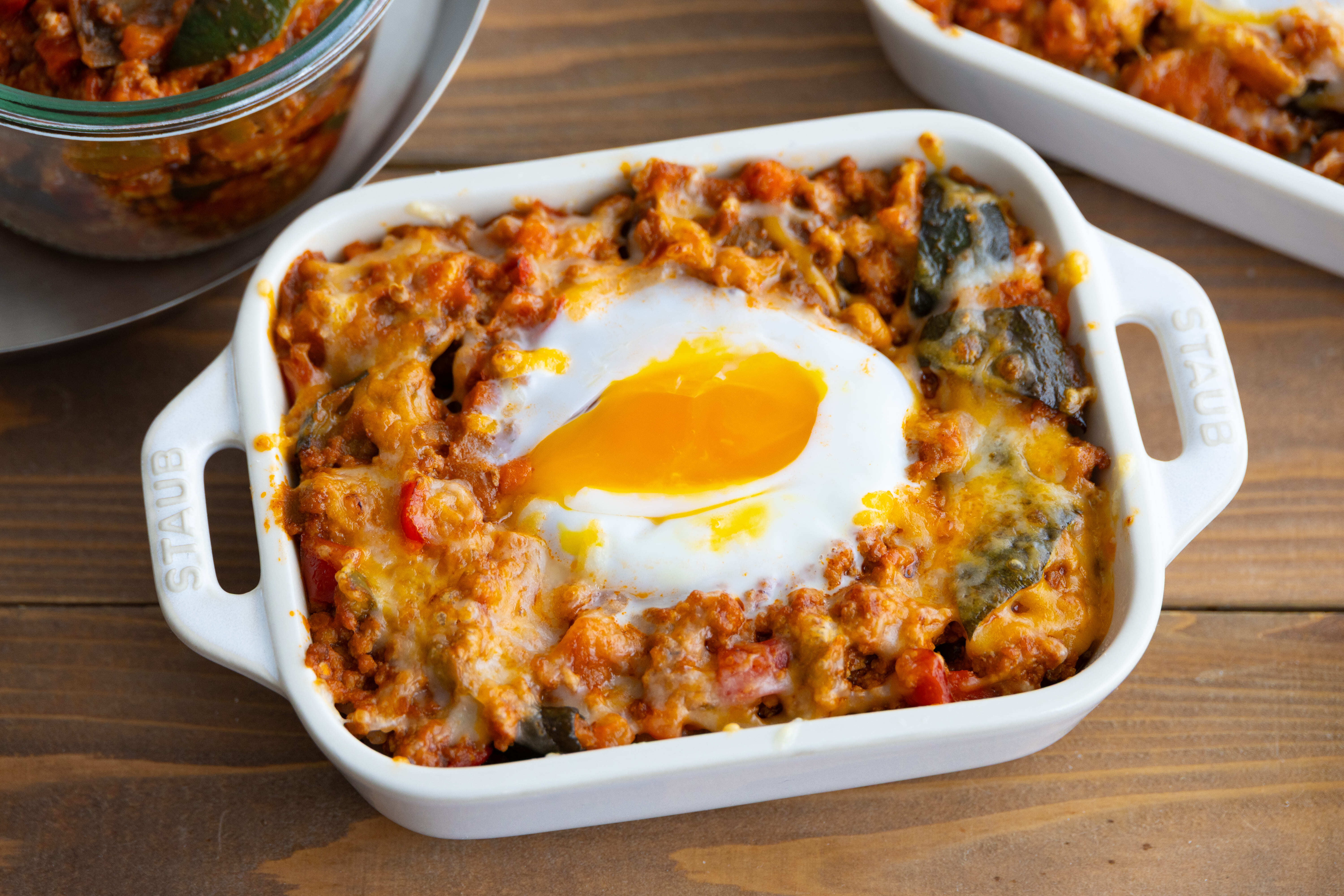 3.2の上にボロネーゼを重ね、中央にくぼみを作り、卵をおとす。卵の部分を避けて、ピザ用チーズを散らし、トースターでこんがりと焼き色がつくまで焼く。