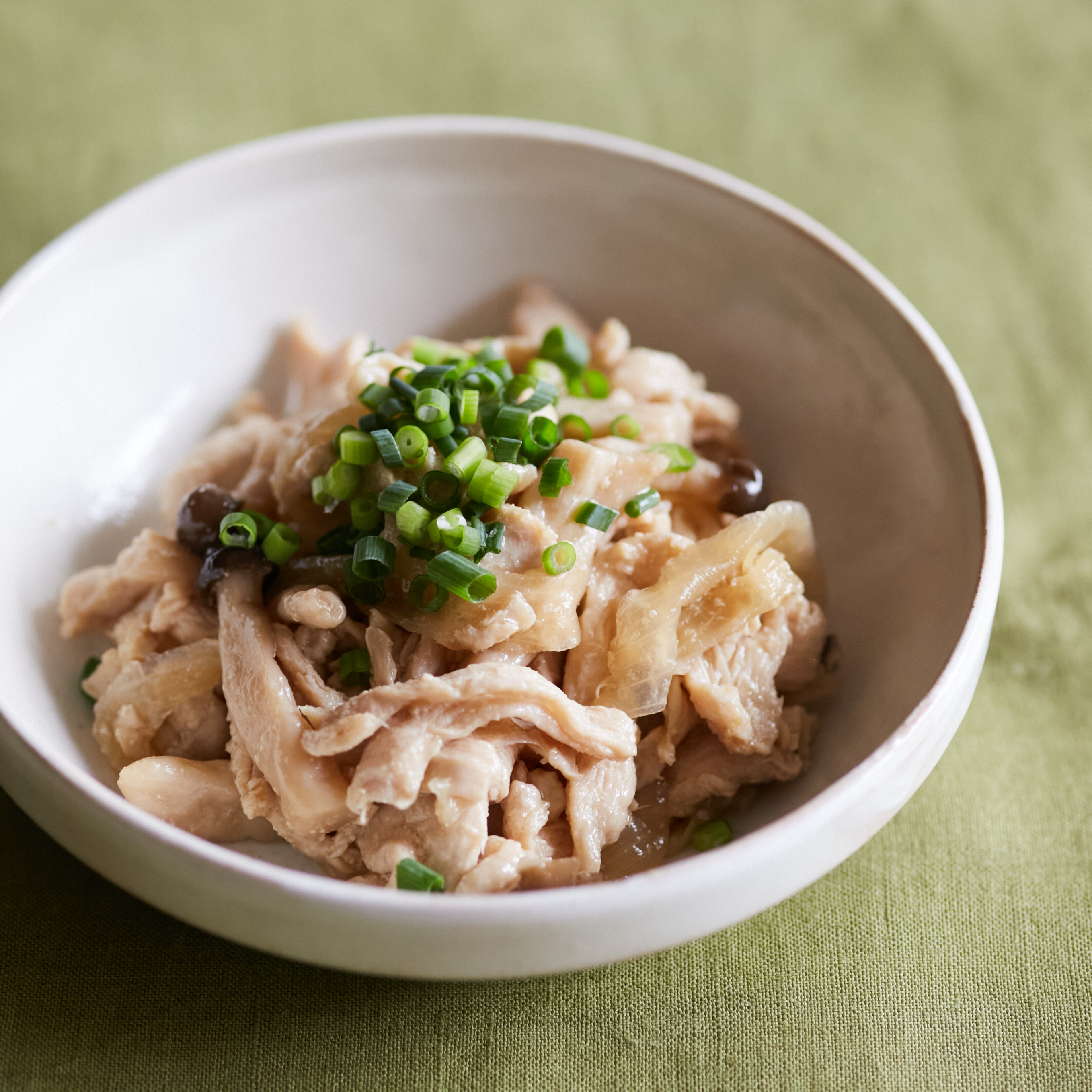 3)鶏むねのあっさり生姜焼き風を加え、温まったら適量の水で溶いた片栗粉でとろみをつけます。