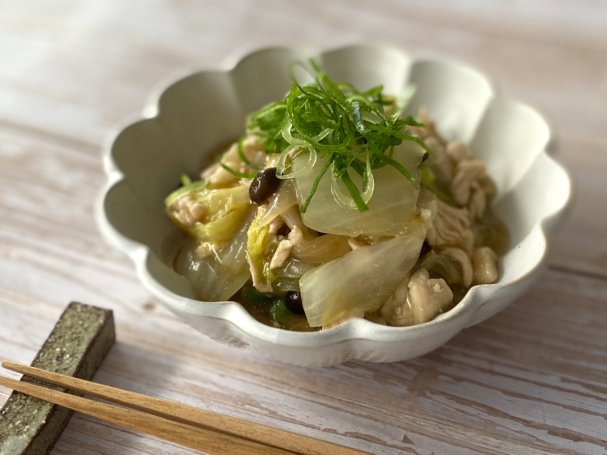 4)器に盛って、ねぎをかざって出来上がり!柔らか白菜に和風あんがからむほっこりした一皿です♪