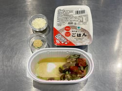 3)鍋に洋野菜とベーコンの塩麹ソテー、ごはん、水100ml、コンソメを入れ、中火で3分煮ます。味をみて足りなければ、塩で整えます。