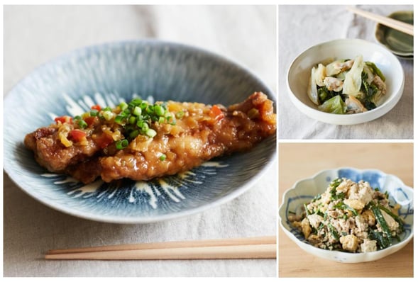 今週は色鮮やかなお魚メニュー「赤魚の唐揚げ 香味だれ」をお届けいたします🚛味が淡白で食べやすい魚である赤魚をカラッと揚げて、さっぱりとした香味だれと合わせました🐟暑くなってきた季節にぴったりの一品です☀️副菜にはアサリをふんだんに使用した「キャベツとあさりのおひたし」と「ひき肉と豆腐のにら炒め」がおすすめです🥢