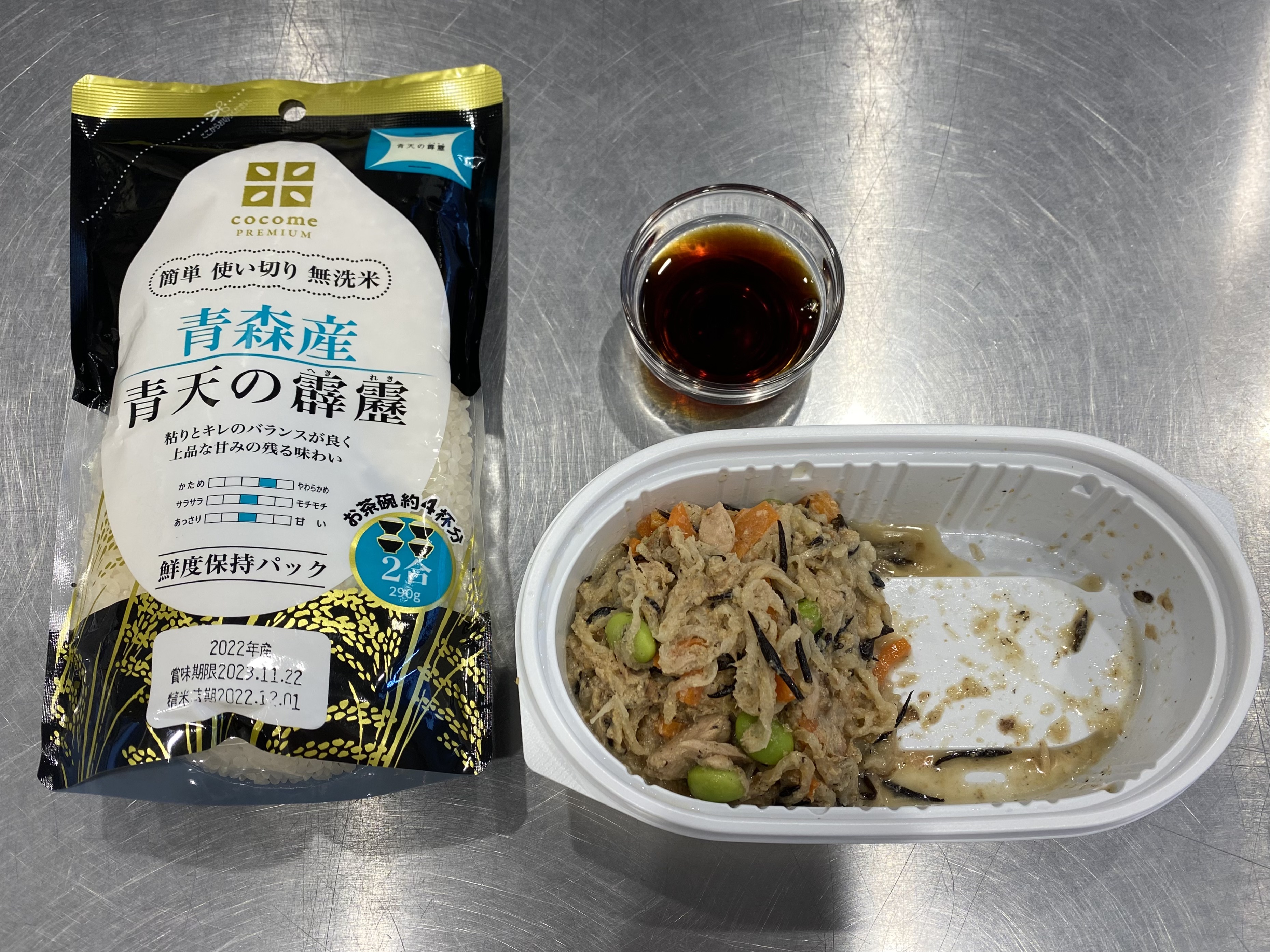 2)炊飯器に米、水(2合の線まで)、醤油を混ぜてから、ひじきと切り干し大根のサラダをのせ炊飯します。(サラダは米に混ぜると炊きムラになることがあるので、のせるだけにします)